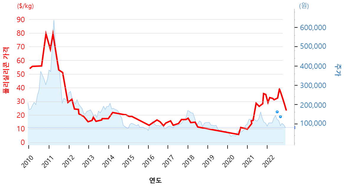작년대비 폴리실리콘 가격이 떨어져 현재는 $23 수준이지만 과거 폴리실리콘 가격이 이정도였을 때 OCI 주가는 약 20만원 주변에서 움직였습니다. 지금은 당시보다 생산원가가 떨어졌기 때문에 20만원 주가가 온다 해도 PER이 7이 안됩니다.