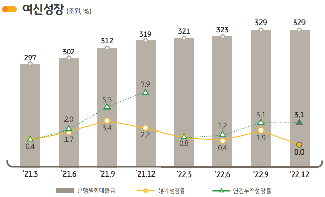 22년말 은행 원화 대출금은 329조원으로 전년말 대비 3.1% 증가, 9월말 대비 유사수준. 이 중 기업대출은 163조원으로 중소기업과 소호, 대기업 모두 고르게 성장한데 힘입어 전년대비 9.4% 증가. 반면 기업대출이 9월말 대비로는 0.2% 소폭 감소하였는데 이는 금리상승과 경기위축으로 소호 대출규모가 축소되고 대기업을 포함해 전반적으로 연말 부채상환이 증가했기 때문. 가계대출은 166조원으로 전년대비 2.4% 감소, 전분기 대비 0.2% 증가하면서 연간 감소세가 안정추세로 바뀜. 주택자금대출은 실수요 증가로 약 1.7조원 증가