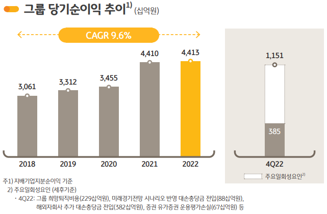 - 22년 당기순이익 4.41조원 전년과 비슷한 수준
