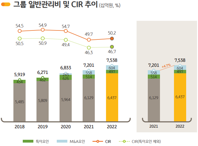 22년 일반관리비 7.54조, 전년대비 4.7% 증가. 그룹 Digitalization 투자 확대되면서 희망퇴직 규모가 확대되었음에도 불구하고 전사차원의 효율화 노력으로 양호하게 관리. 4분기 일반관리비는 2.36조원으로 약 3162억원의 희망퇴직비용 등 계절적 요인으로 전분기 대비 큰 폭 증가
