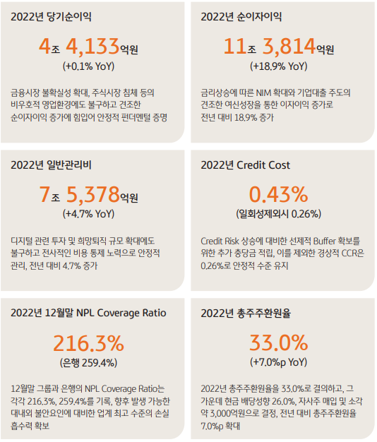 : 국내외 대규모 충당금 설정으로 전년대비 Credit cost가 큰폭으로 증가했지만 충당금을 제외한 Credit cost는 26bp로 여전히 안정적인 수준으로 관리되고 있음. 22년말 국내영업 기준 그룹 NPL coverage ratio는 전년말 대비 7% 상승한 216%로 업계 최고 수준을 유지하는 NPL coverage ratio를 감안할 때 대내외 리스크를 대비해 충분한 버퍼를 확보하고 있음