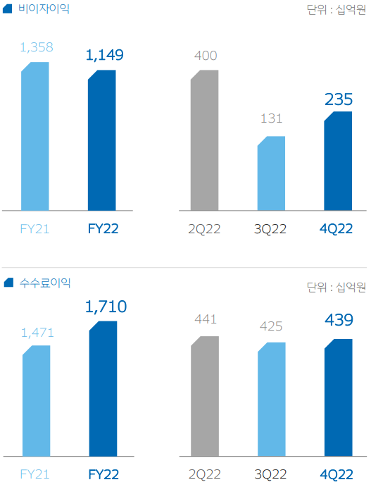 순이자이익은 8.70조원 비이자이익 1.15원. 이자이익은 기준금리 인상에 따라 매분기 꾸준히 증가. 비이자이익은 어려운 업황 속에서도 자회사들이 핵심 수수료 중심으로 견조한 실적 보임