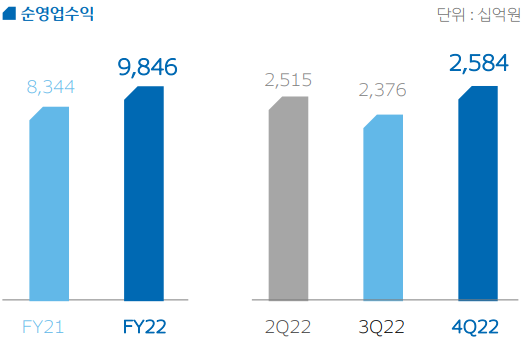 22년 그룹의 순영업수익은 9.85조원으로 전년대비 18% 증가.