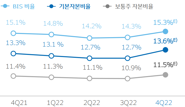 22년말 그룹 보통주 비율은 11.5%로 전년말 대비 0.1% 증가할 것으로 예상. 이는 하반기 중 환율 급등 영향으로 위험가중자산이 일시적으로 증가하였음에도 불구하고 견조한 이익증가와 경기상황을 고려한 적극적인 위험가중자산 관리의 결과임.
