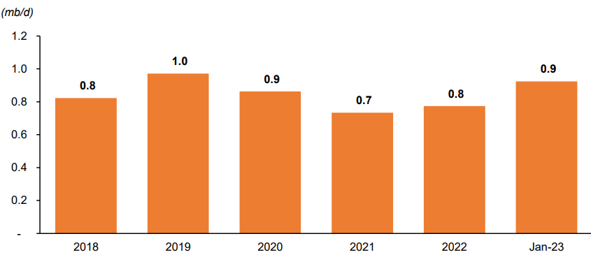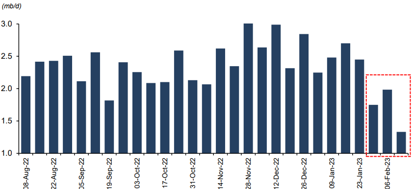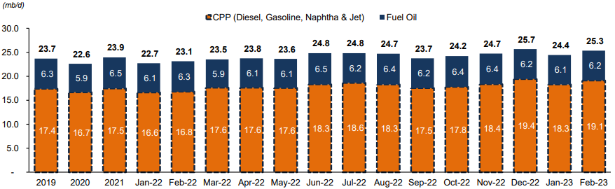 - 22년 12월에 석유제품(CPP)의 해상운송이 19.4mb/d로 최대치를 갱신함(이후 폭설로 인한 공장 가동률 저하로 감소)