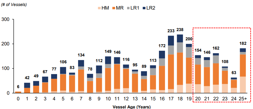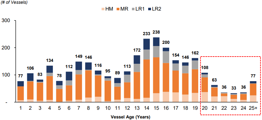 정유제품 톤마일 수요 추이 - 석유제품 탱커선박은 최근들어 신조선발주가 적은 상황이 지속되어 왔으므로 당분간 시장에 신규로 공급되는 선박은 매우 제한적이며, 선령 20년 이상의 선박이 약 9%대 점유.