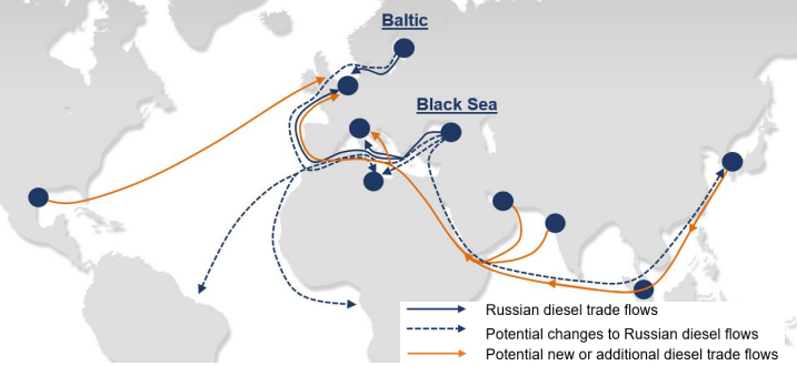 - 발틱해를 통해서 유럽 북부, 흑해를 통해서 유럽 남부로 짧은 해상운송거리를 통해 러시아산 CPP가 EU로 공급되었으나, 금수조치로 인해 러시아발 수출량과 EU향 수입량이 훨씬 먼 항로를 통해 운송됨.