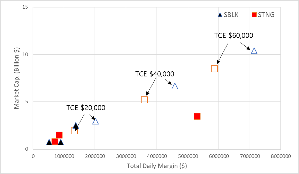 지금대로라면 스타벌크는 TCE $20000 이하에 해당하는 주가, 스콜피오는 TCE $30000에 해당하는 주가이다.