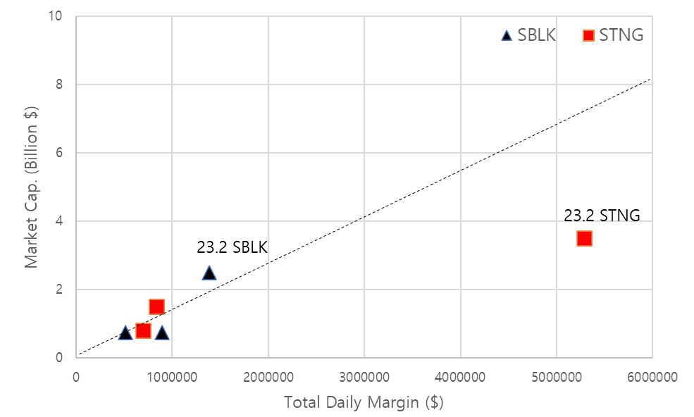 운임에 따른 각사의 적정 시총 스타벌크가 선박수가 많아서 동일 운임에도 Margin 규모가 높게 나온다.