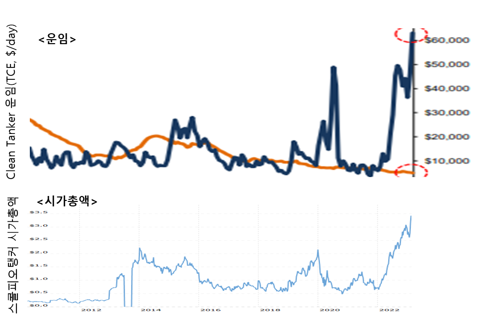 Product tanker 운임과 스콜피오탱커 주가 관계