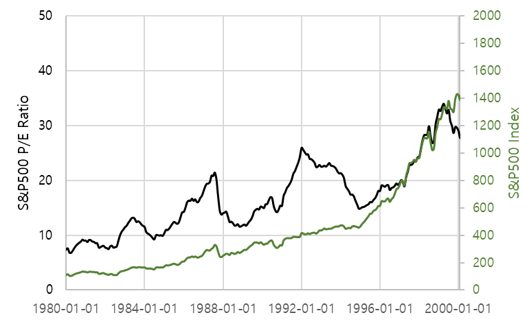 - 1980년대 초는 고금리를 유지함에도 주가가 폭락하지 않았는데, 이는 P/E ratio에 거품이 없었기 때문으로 보인다. (당시 P/E Ratio 10 이하)