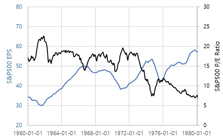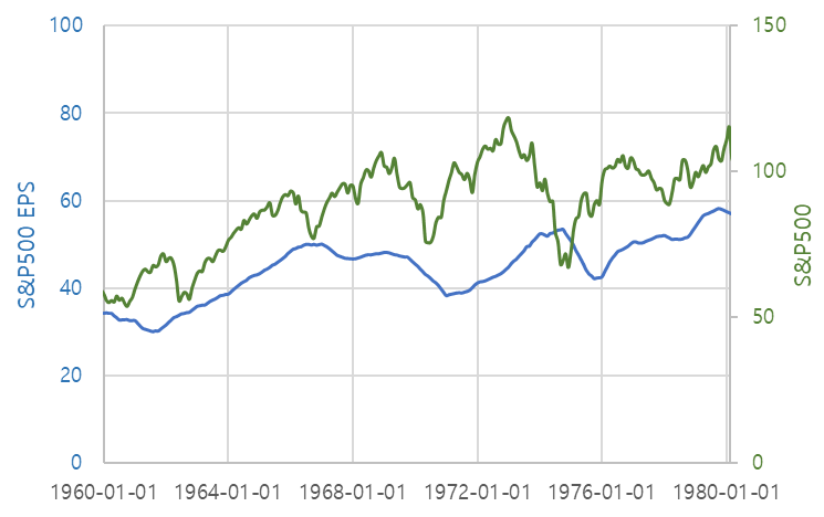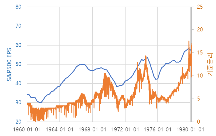 - 1970년 초 10% 금리에 EPS 20%, 주가지수 25% 하락
