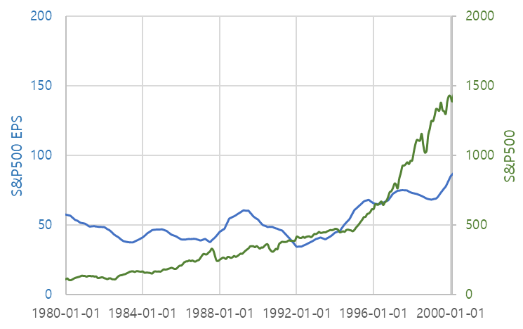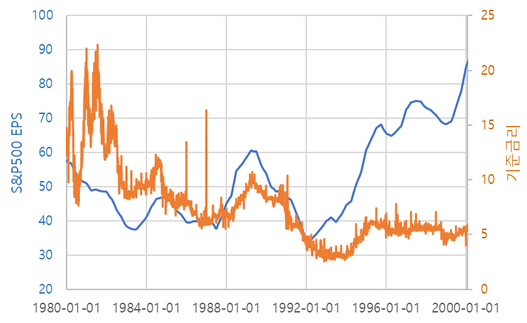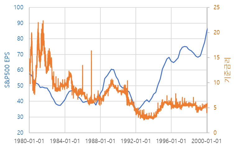 - 1980년대 초: EPS가 20%정도 하락해도 고금리를 유지하고, 심지어 금리를 20%까지 재폭등시킨 유일한 시기로, EPS는 약 35% 하락했다.($58→$38)