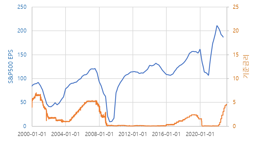 2000~2023년 현재 - 금리를 인상하면 어느정도 기간이 지난 뒤부터 EPS가 떨어진다. 이 때 EPS 20% 조정은 일반적이다.