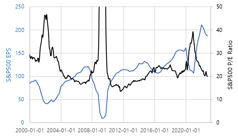 - 5%를 상회하는 금리가 일정기간 유지된다면 EPS 하락폭은 매우 클 가능성이 있다. 현재 전세계적으로 과도한 부채부담을 가진 상태에서 고금리가 유지되면 금융위기가 오지 않는다는 법이 없고 이 경우 EPS 하락폭이 50%이상일 가능성도 배제할 수 없다. 그러나 이러한 특이상황에서는 PER이 매우 높아지며 EPS 하락폭에 비하여 지수의 하락폭은 적을 것이다.