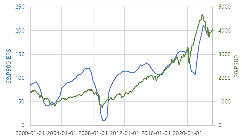<2000~2023년 현재> - 중장기적 싸이클적 관점에서 S&P500 지수는 기업실적보다 변동성이 적고, 이는 불황에서 높은 PER이 EPS 하락폭을 보상해주기 때문이다.