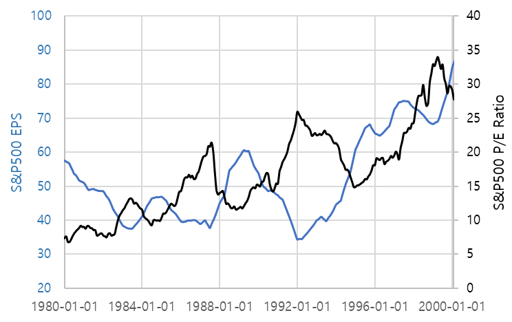 - 2000년대 초(닷컴버블): 기존 금리가 5% 전후였음에도 약간 상승한 7% 수준에서 EPS가 절반까지 하락했다.