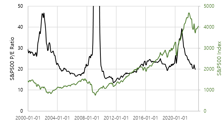 - 5% 금리에서는 S&P500의 PER 17까지의 밸류에이션 하락은 가능성이 있다. 그러나 PER이 낮은 것은 오히려 실적이 버텨주는 구간일 것이고, 실적이 빠른속도로 떨어진다면 그 구간에서 PER이 오히려 올라갈 수 있다. 과거 경험상 EPS의 저점에서 PER이 저점일 가능성은 거의 없다. 만약 그렇다해도 아주 일시적일 것이므로 강력한 매수 기회이다.