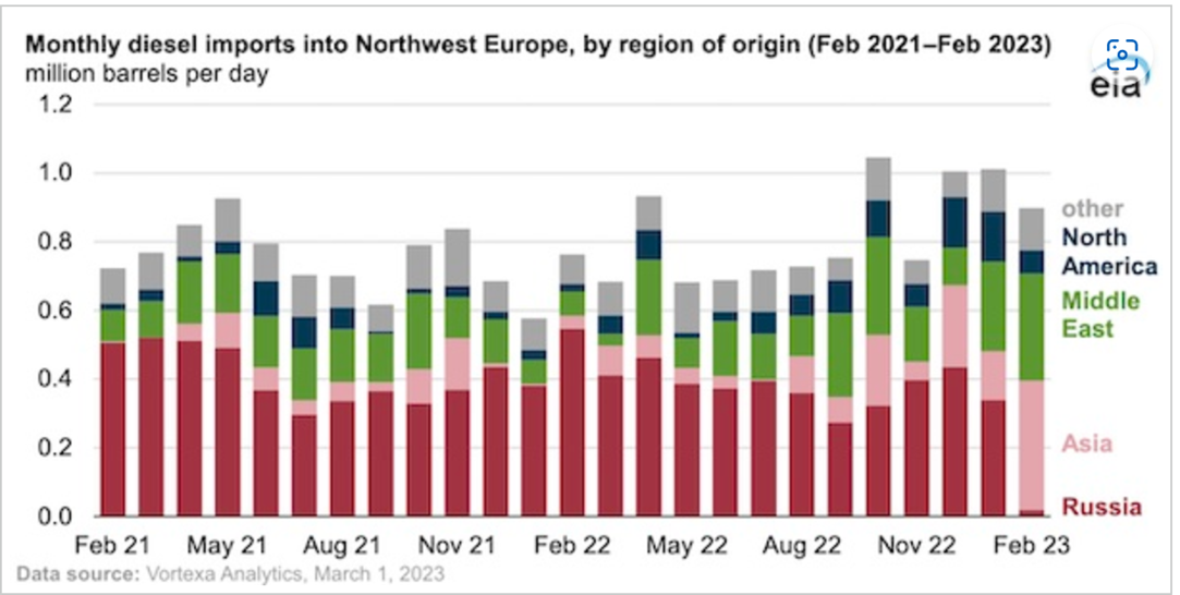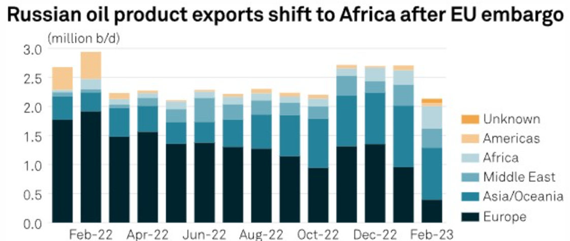 올해 2월 5일 이후 EU의 러시아산 석유제품 금수조치가 시작되었다.