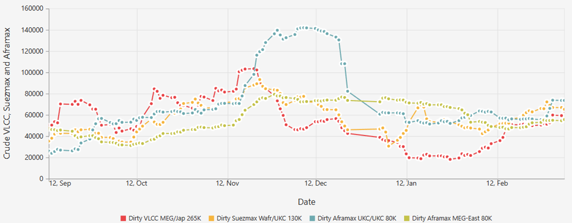 1월 중순에 $38,000였던 스팟운임이 3월 10일 $103,900로 급등했다. 중동에서의 VLCC 수요가 가장 왕성하다고 하는데, 아마 내부수요를 저렴한 우랄산 원유로 충당하고, 자국 생산분을 수출하기 위함이 아닌가 싶다.