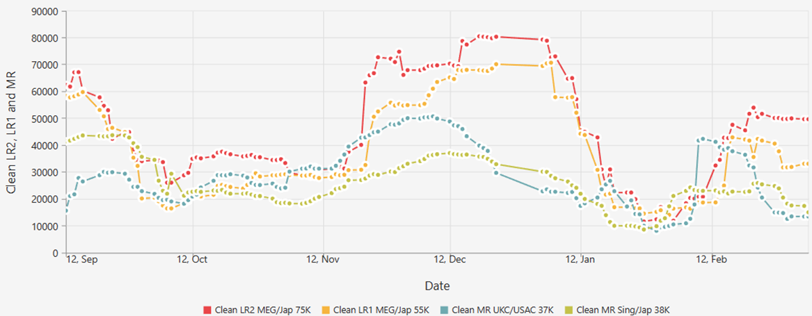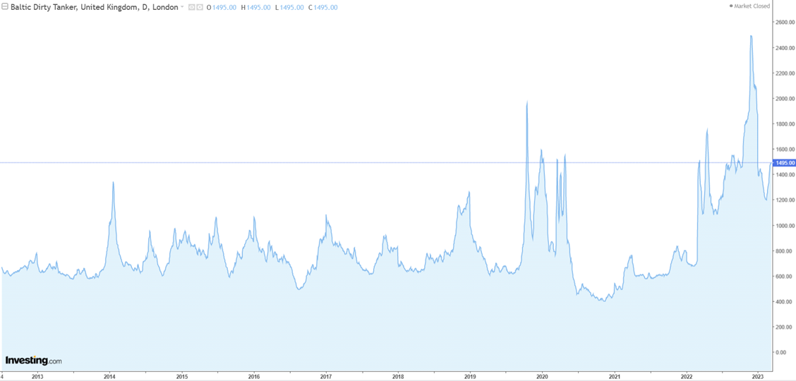 23년 2월 5일 기준으로 EU의 금수조치가 적용되었고 LR1,2와 MR 등 Product tanker는 23년 1월에 운임이 가장 높았다.