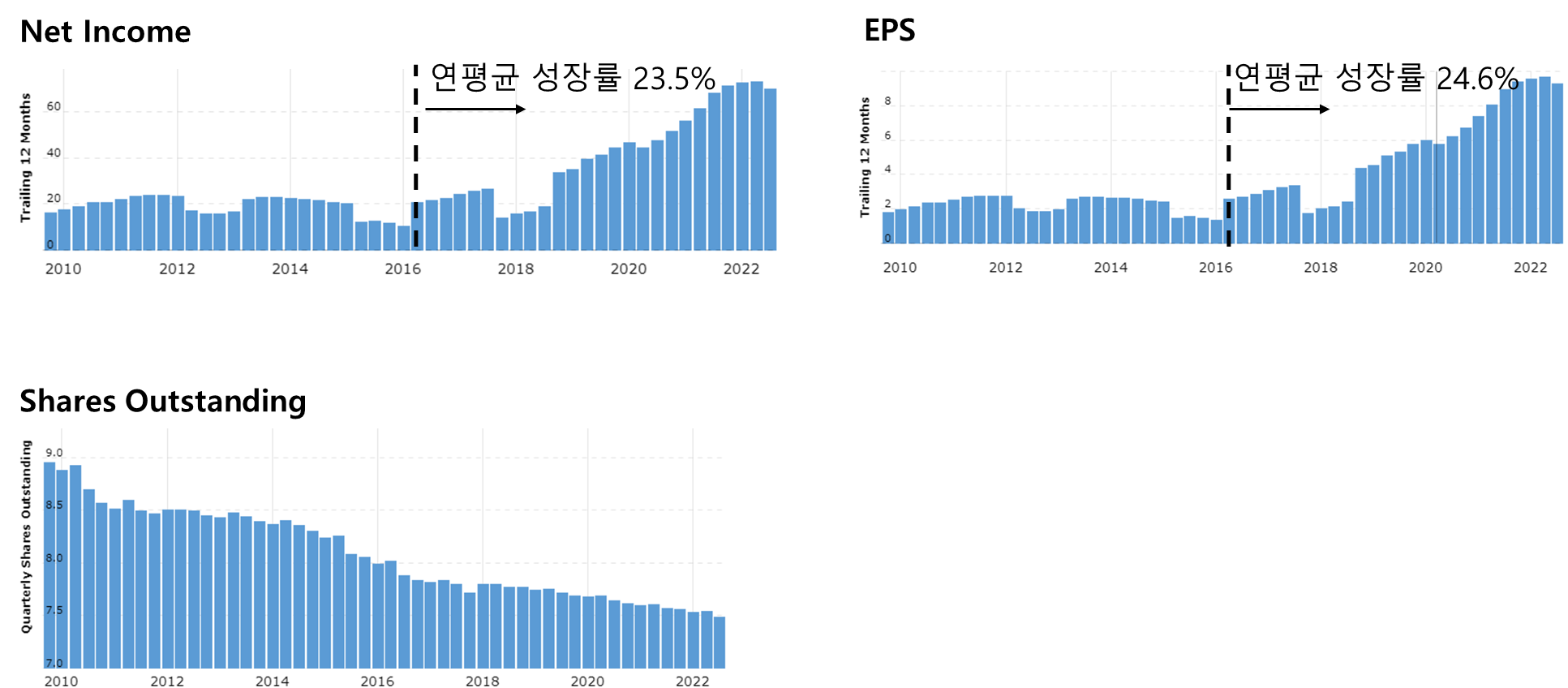 순이익 기준으로 연평균 성장률 23.5%이고, 자사주매입에 따라 주식수가 줄어드는 효과로 EPS는 1.1% 높은 연평균 성장률 24.6%로 과거 6년간 성장했습니다.