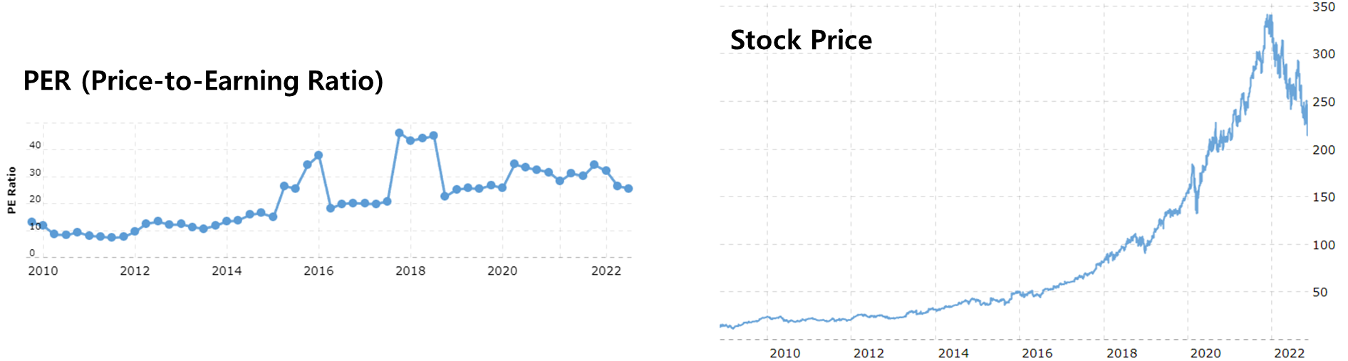 마이크로소프트는 클라우드서비스의 성장성은 의심할 여지가 없고, Teams와 같은 플랫폼이 대기업들을 대상으로 빠르게 확산되고 있습니다. Office 제품들의 구독서비스 전환으로 신규 현금흐름이 증가하고 있죠. 이러한 영향으로 아래 차트에서 볼 수 있듯이 2016년 이후 최근 6년간 매우 안정적인 성장을 보여왔습니다.