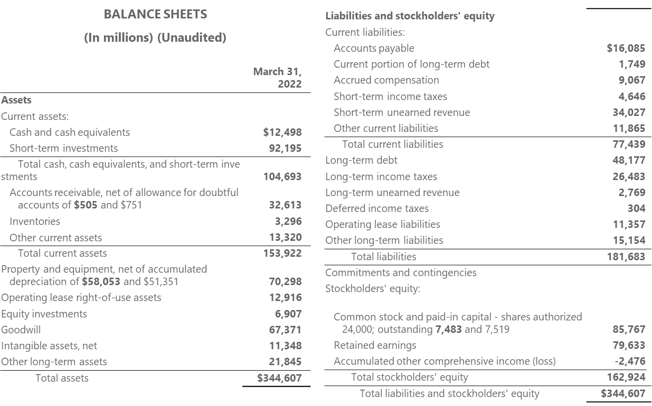 전체 부채 중 유동부채가 절반이 좀 안되는데($77.4B), 이 중 이연수익(unearned revenue)는 서비스를 제공하지 않았는데 미리 지급받은 대금이 부채로 잡힌 것이므로, 돈으로 갚아야 하는 부채는 아니다. 즉, 돈으로 빚진 금액은 $40B 수준이며, 연간 순이익이 $60B 이상이므로 재무적으로 건전하다고 볼 수 있습니다.