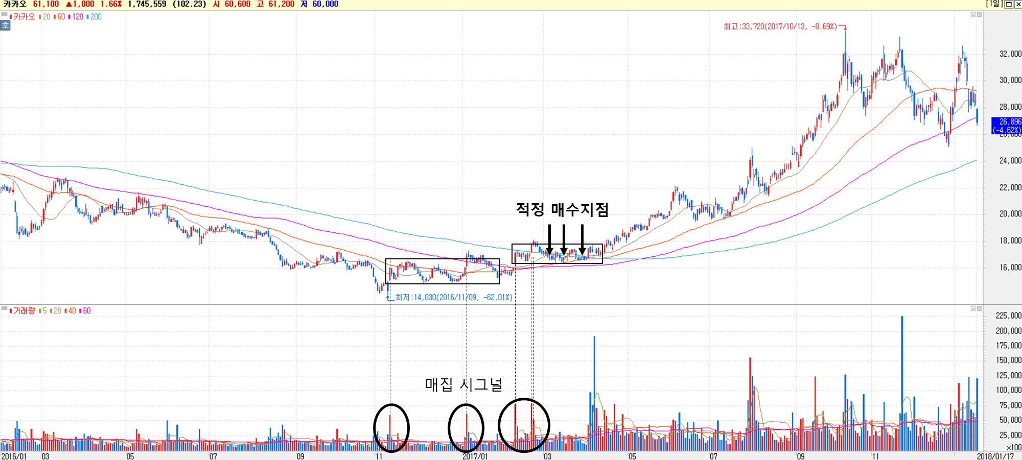 역시 카카오의 장기 랠리를 나타내는 차트로, 2017년의 주가상승시기이다.