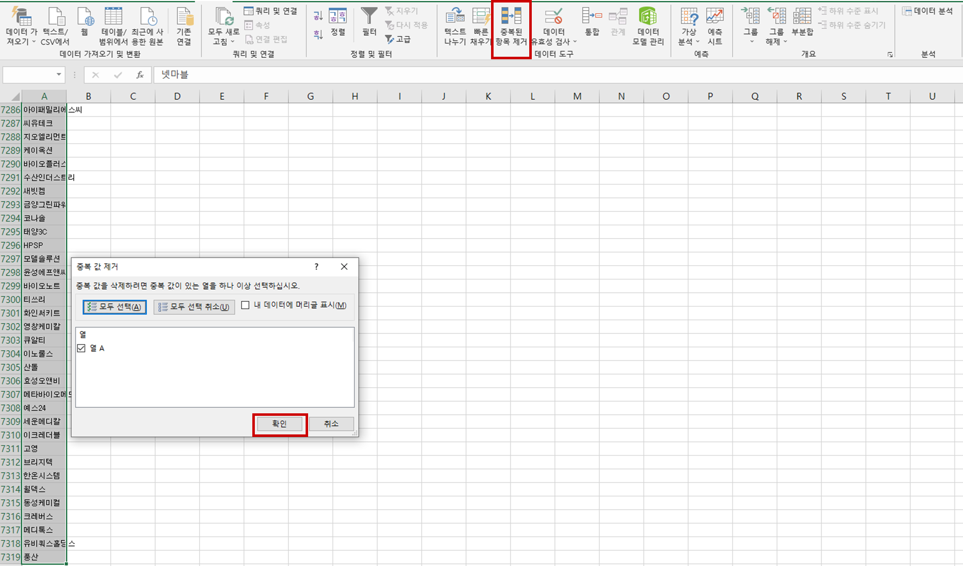 중복된 항목 제거를 통해 대부분 상장사를 중복없이 A열에 나열시킨다.
