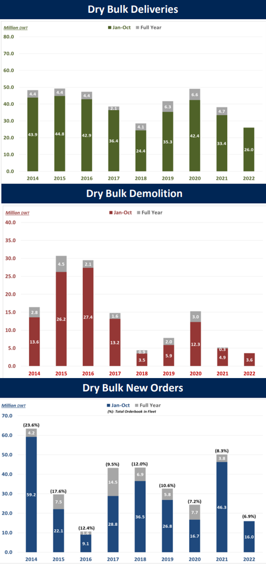 지난 12개월간 총 선박수 증가율이 2.8%였습니다. 21년도 증가율 3.4% 대비 낮아졌으며 업계에서는 23년도 이후 한동안 2%를 넘지 못할 것으로 보고 있습니다. 이렇게 보는 이유는 현재 전세계 총 벌크선박대비 신규발주된 벌크선박비율이 6.9%로 역사적으로 낮은 수준인데, 23~25년으로 나뉘어 인도될 것과 폐선예측을 종합적으로 고려한 결과입니다.